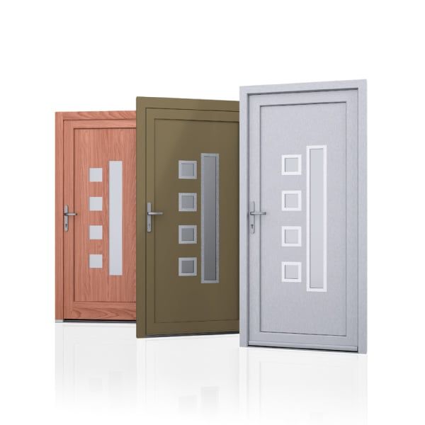 3 portes d'entrée rose bleue rouge grise avec 3 vitres longues