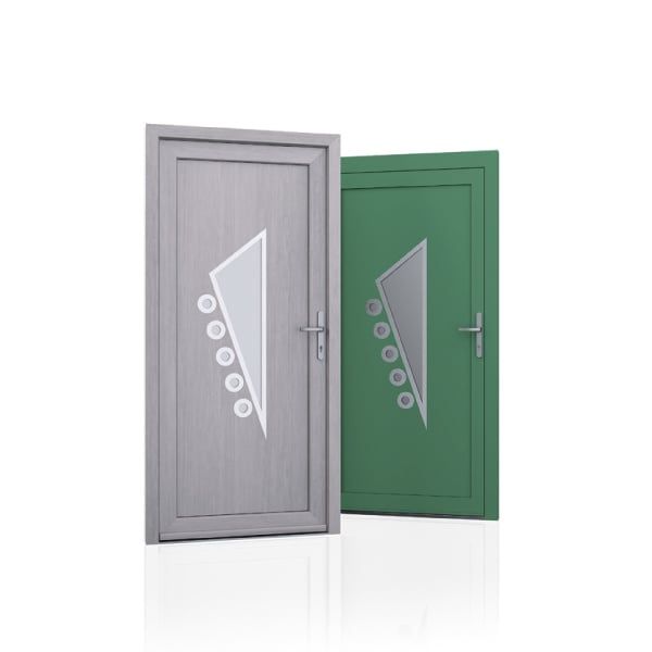2 portes d'entrée bleu-vert et grise avec une suite de vitres en forme de triangle